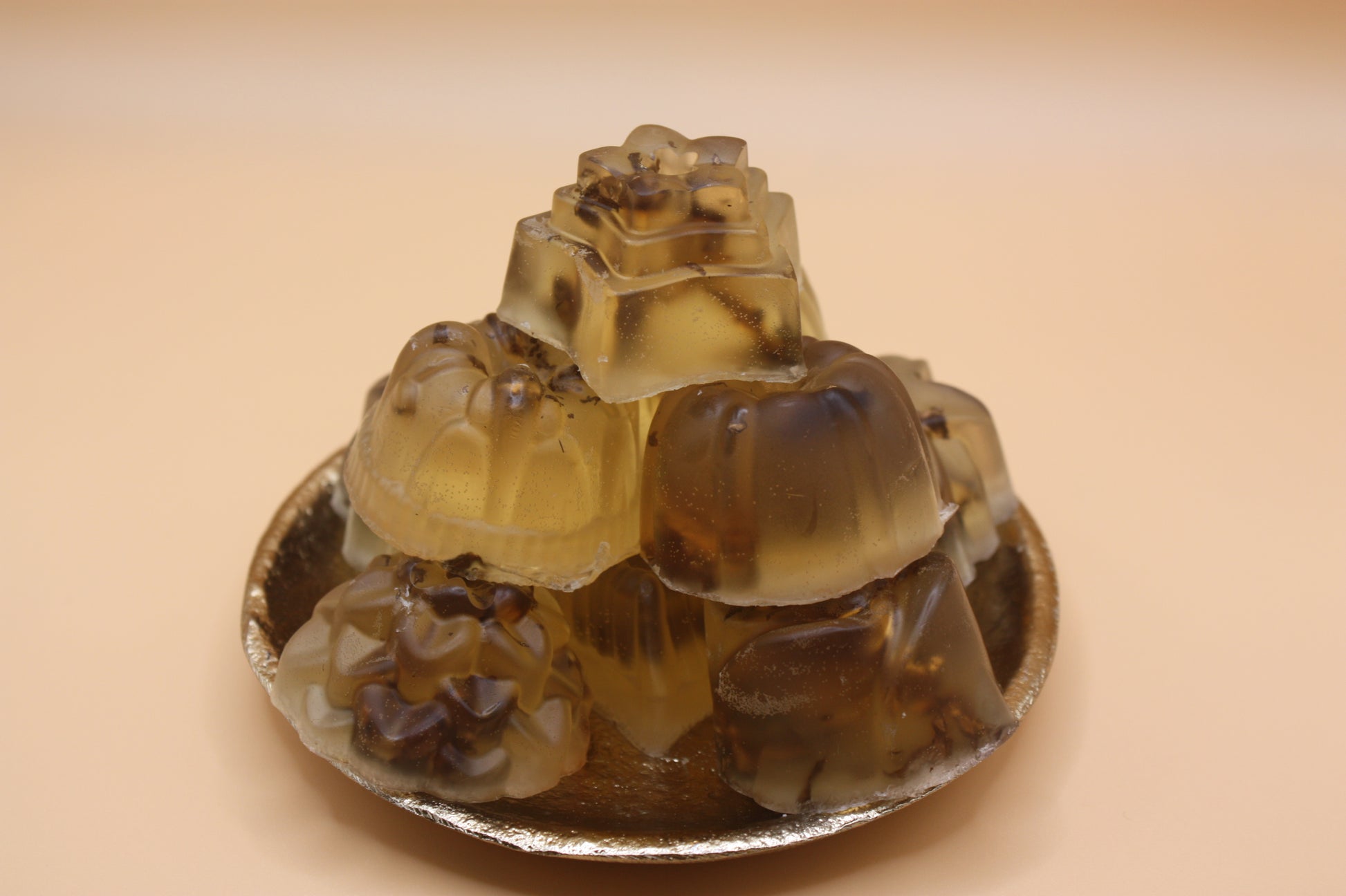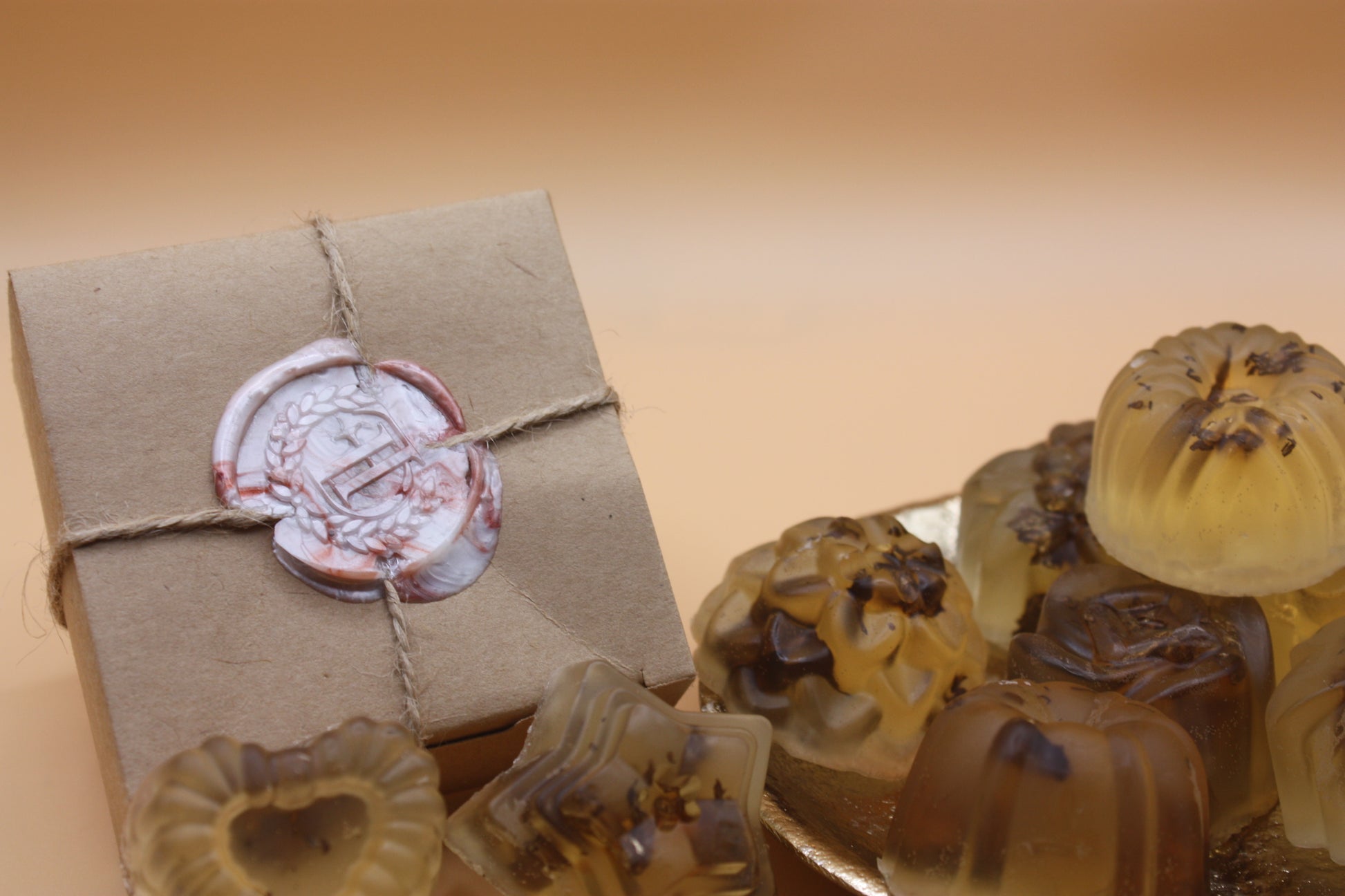 - Finas láminas de pan de oro decorativo, que aportan un toque brillante y elegante, transformando cada jabón en una pieza única.